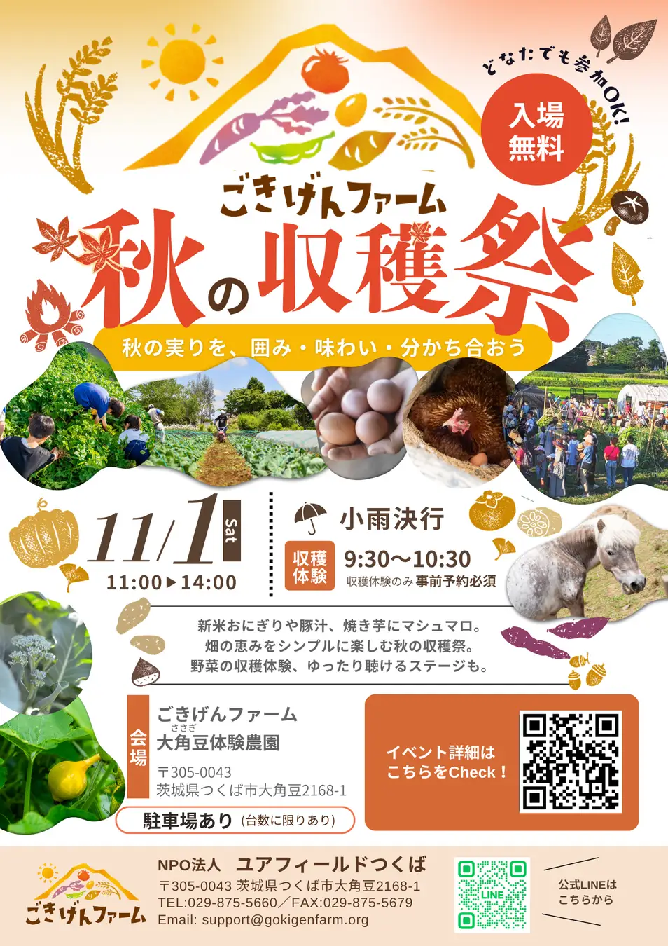 - 内容: 屋台(新米おにぎり、豚汁、卵かけご飯、射的、おかしつかみ等)、物販(ごきげん野菜、手づくり石鹸など)イベントステージ