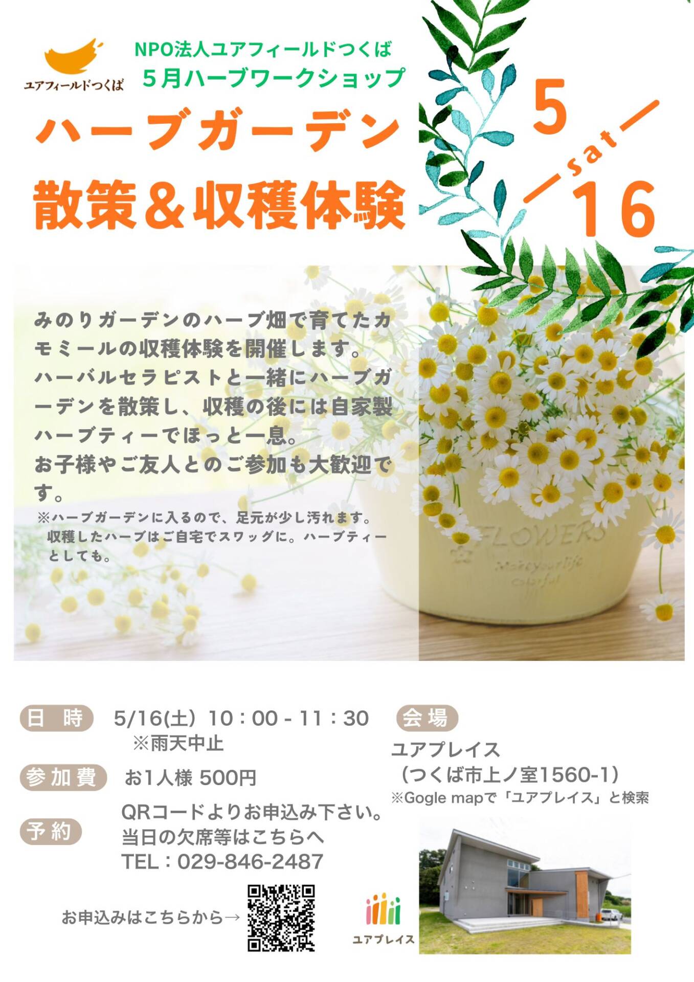 生活介護事業所「みのりガーデン」のハーブ畑で育てたカモミールの収穫体験イベントです。ハーバルセラピストと一緒にガーデンを散策し、収穫体験後には自家製ハーブティーでほっと一息しませんか?お子様やご友人との参加も大歓迎です。